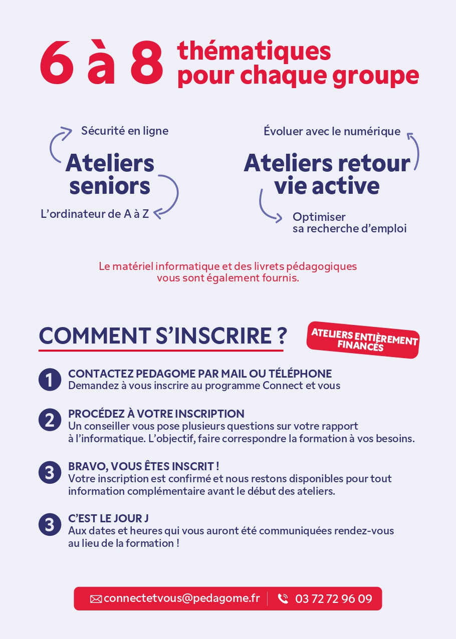 Pour toutes inscriptions ou demande d’information concernant les ateliers, veuillez appeler Pedagome au numéro suivant : 03 72 72 96 09