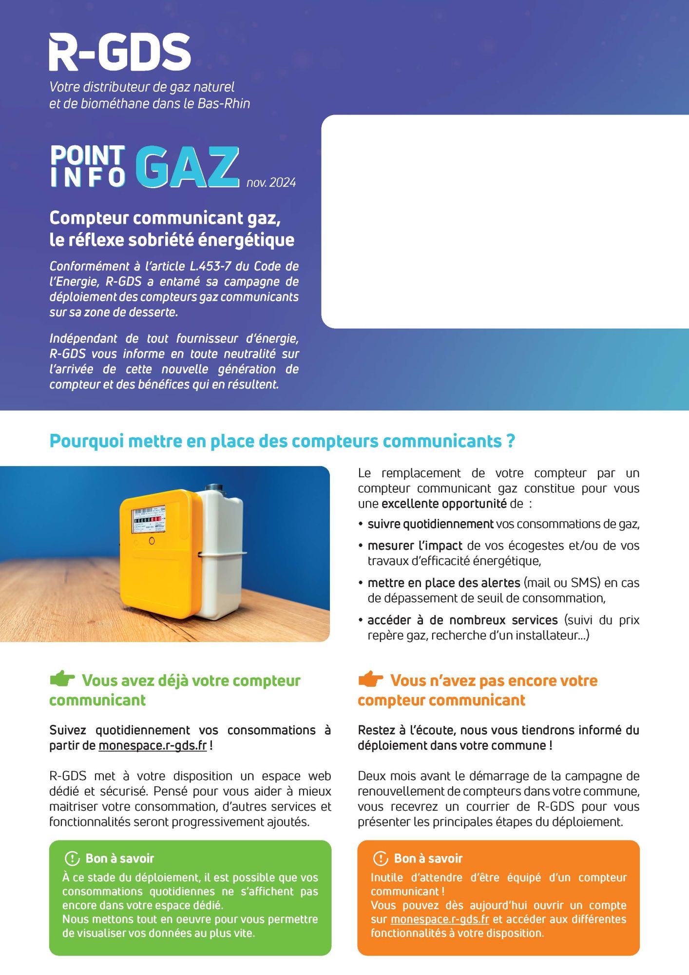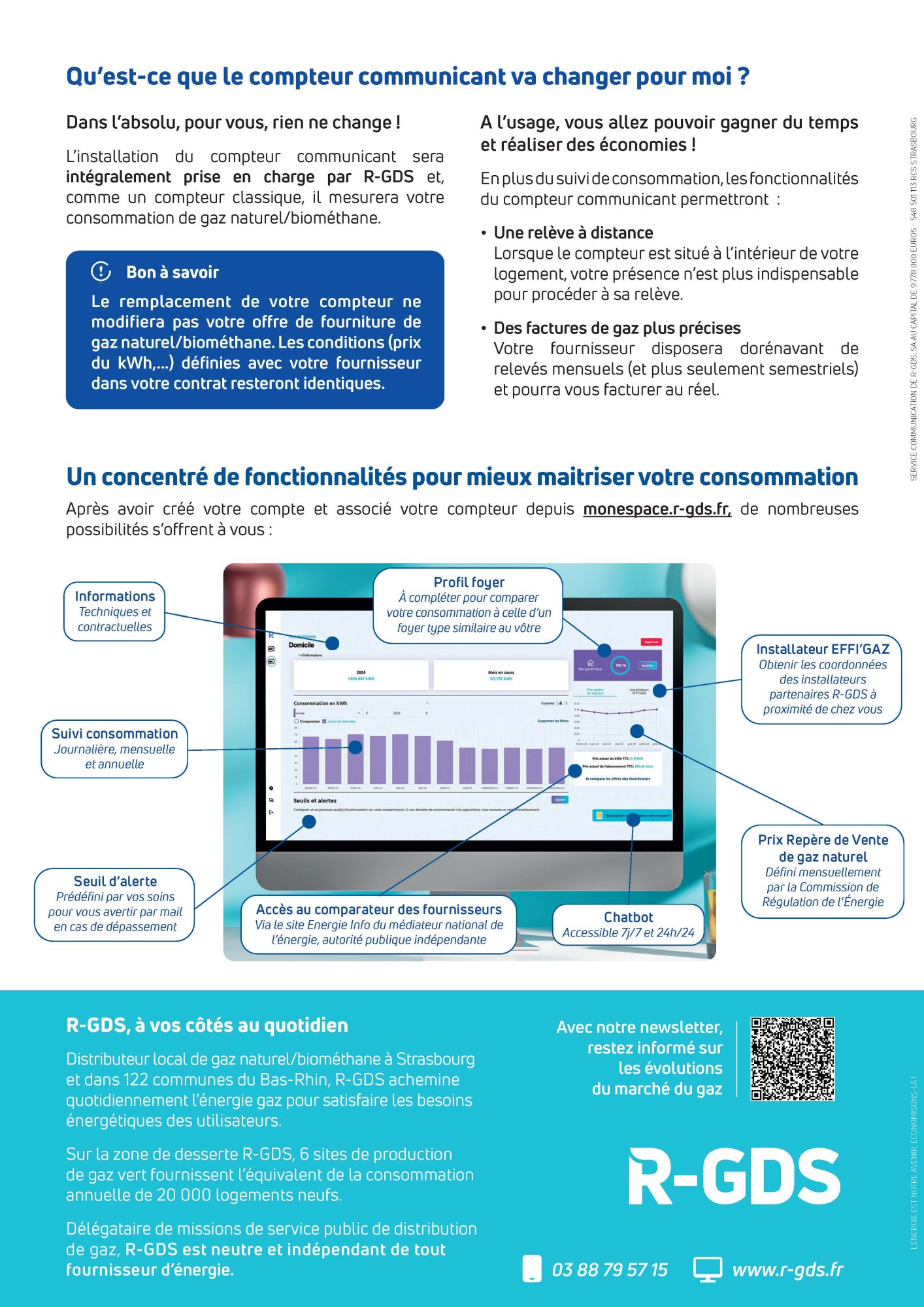 Si vous n’avez pas encore de compteur communicant, vous recevrez un courrier de R-GDS environ deux mois avant le début de la campagne d’installation dans votre secteur. Une fois votre compteur installé, vous pourrez créer un compte sur monespace.r-gds.fr et accéder aux fonctionnalités disponibles.