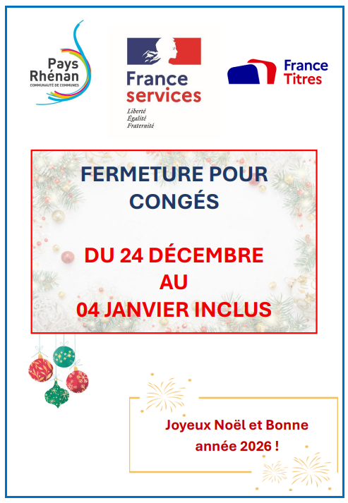 Fermeture pour congés de France Services et du service France Titres, du 24 décembre au 4 janvier 2026 inclus.