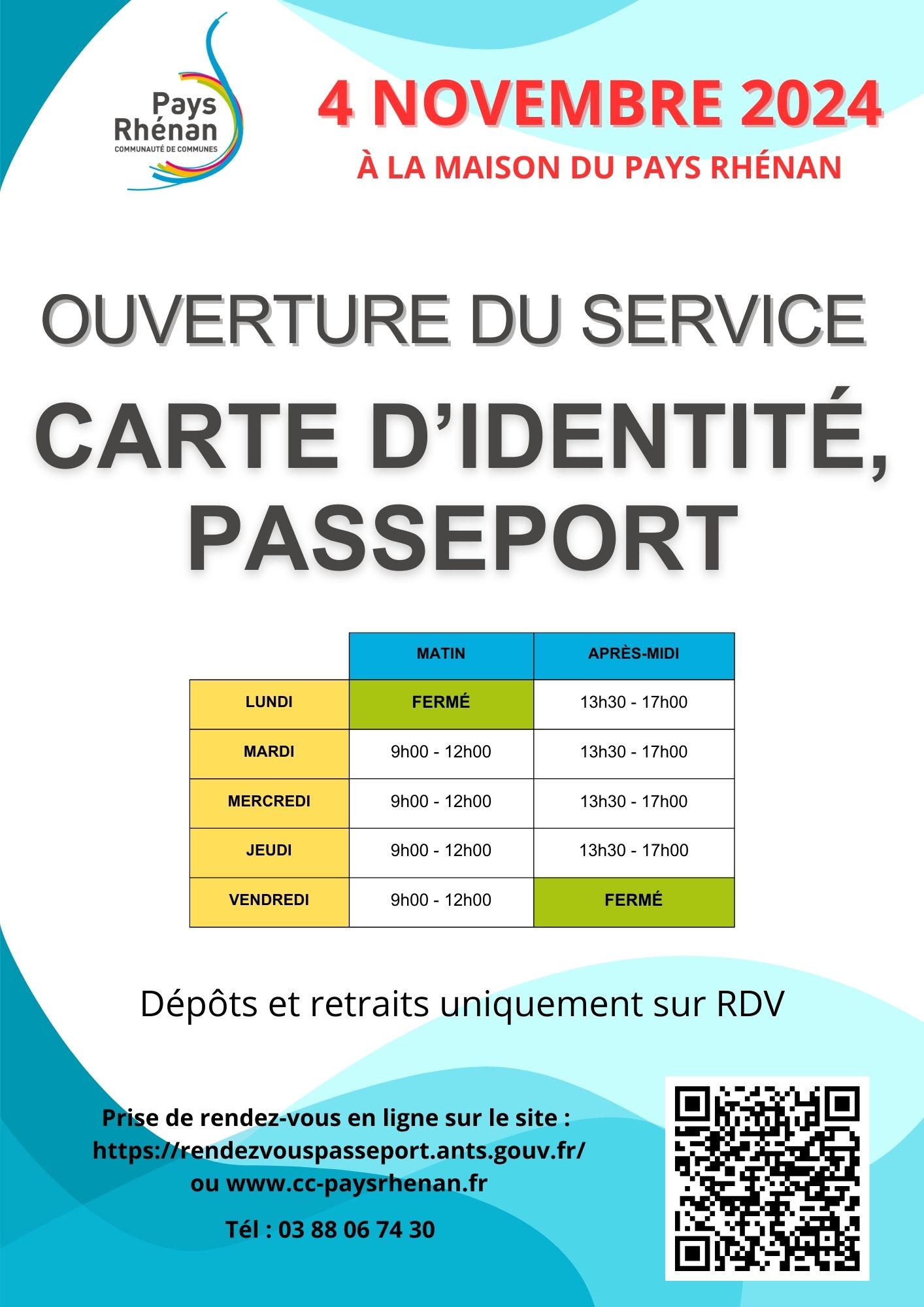 Pour prendre rendez-vous en ligne, veuillez consulter le site https://rendezvouspasseport.ants.gouv.fr/ ou www.cc-paysrhenan.fr.
