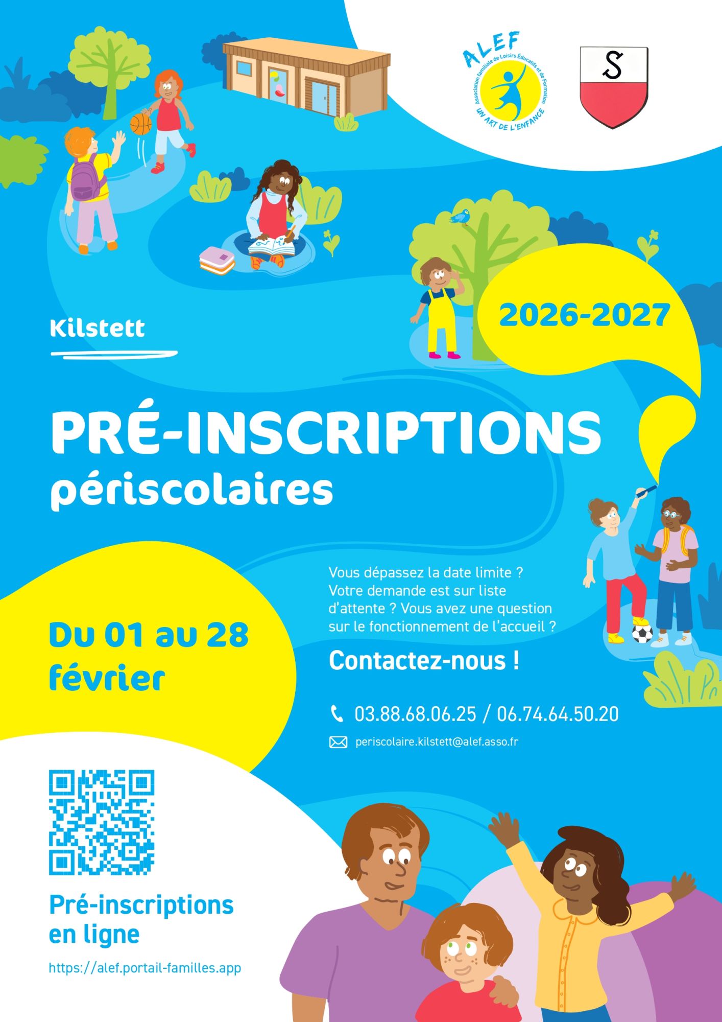 Contactez la direction du périscolaire par téléphone au 03 88 68 06 25 ou au 06 74 64 50 20 ou par mail à periscolaire.kilstett@alef.asso.fr
