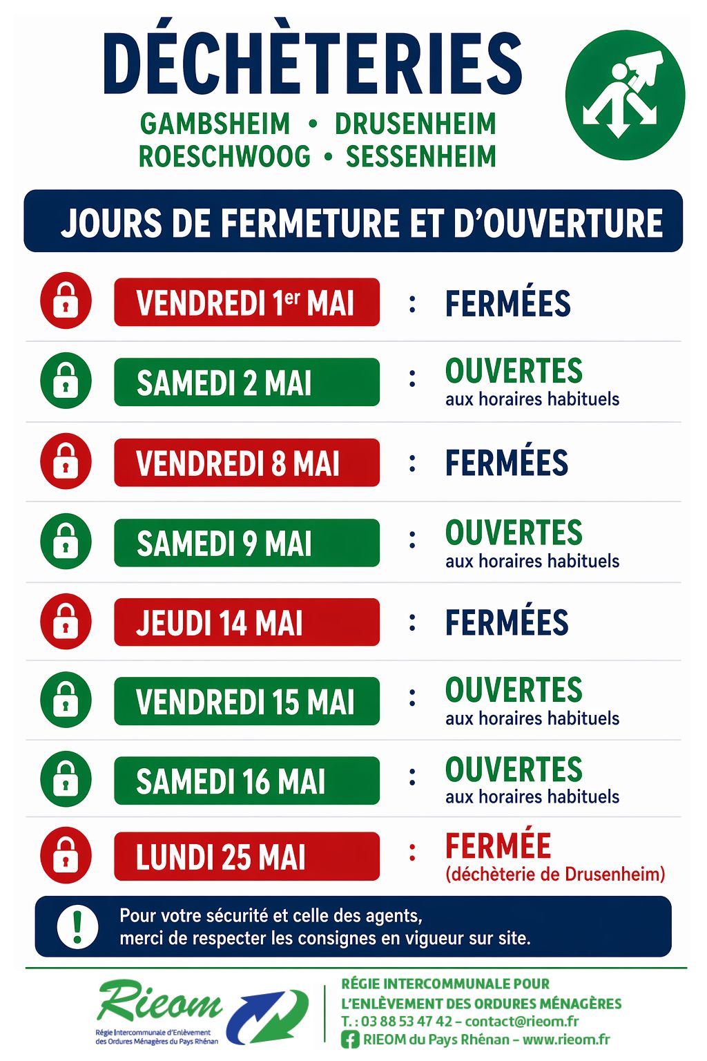 Les déchèteries de Gambsheim, Drusenheim, Roeschwoog et Sessenheim seront fermées les jours fériés.