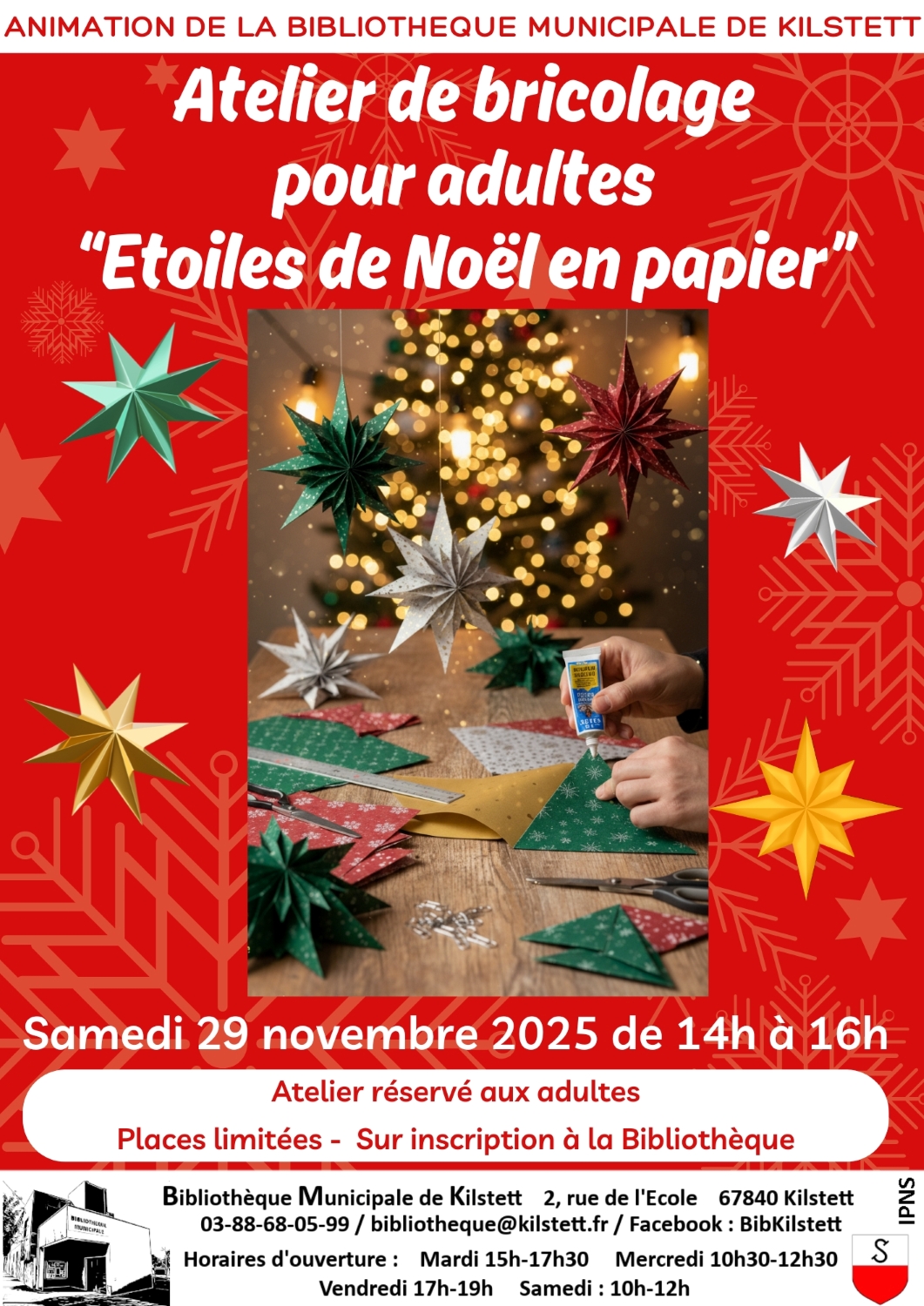 La Bibliothèque de Kilstett organise un « Atelier de Bricolage sur le thème des étoiles de Noël en papier», pour les adultes, animé par des membres de l’équipe de la Bibliothèque :