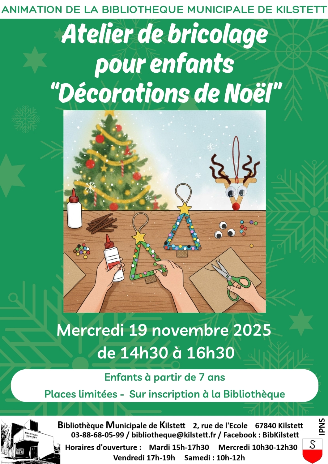 La Bibliothèque de Kilstett organise un « Atelier de Bricolage sur le thème des décorations de Noël », pour les enfants de plus de 7 ans, animé par des membres de l'équipe de la Bibliothèque :