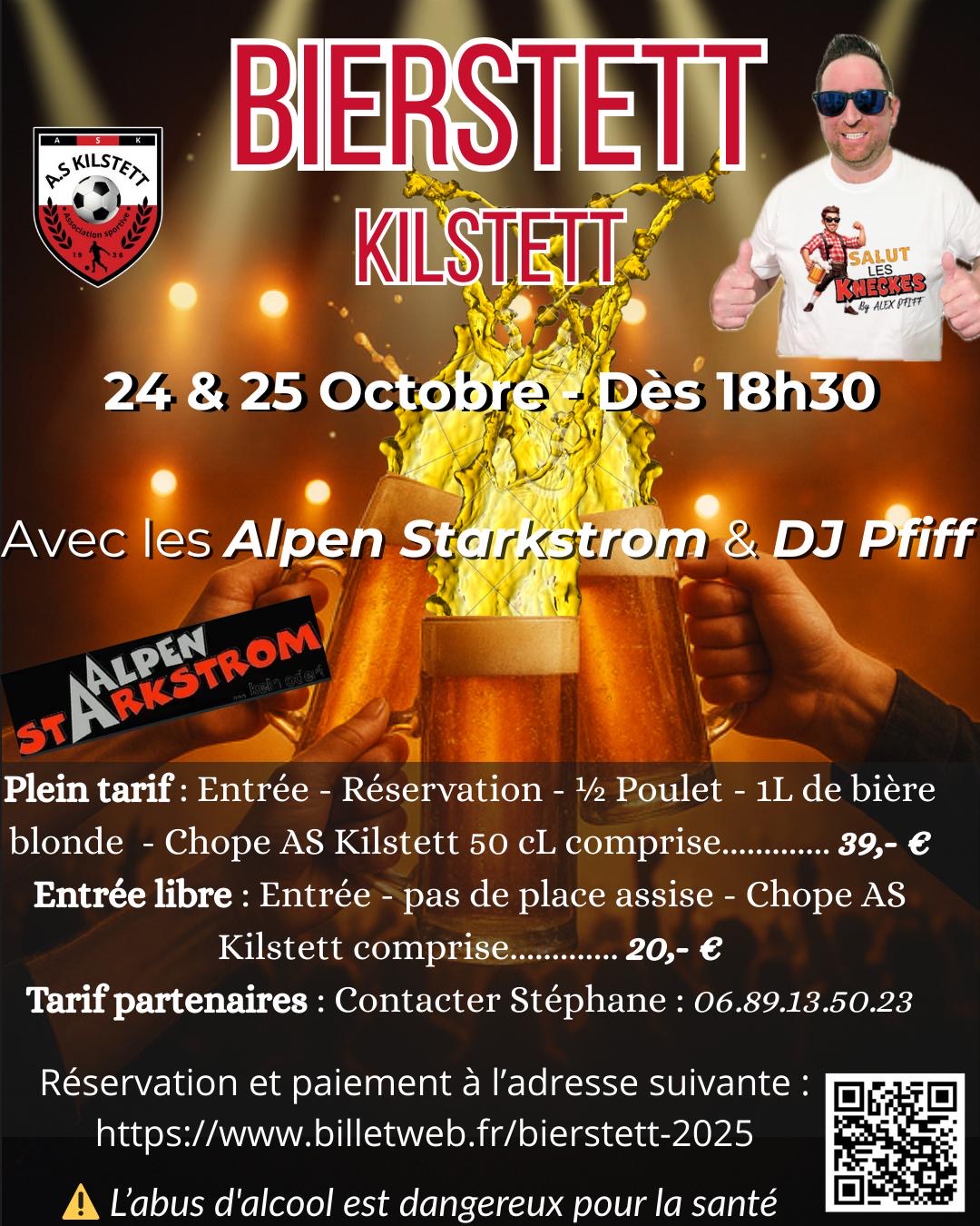 Bierstett (fête de la bière) organisée par l'Association Sportive de Kilstett le samedi 24 octobre et le dimanche 25 octobre à la Salle de la Musique et de la Culture, avec les Alpenstarkstrohm et DJ Pfiff.