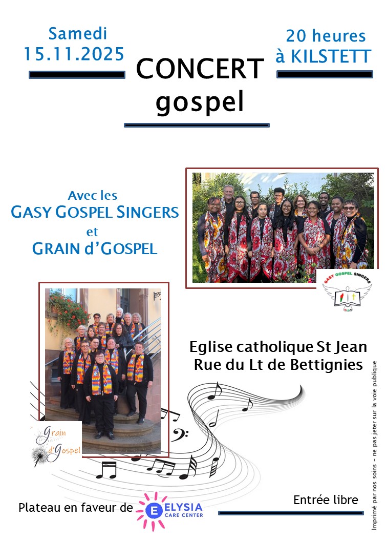 Les Gasy Gospel Singers et Grain d'Gospel vous donnent rendez-vous pour une soirée pleine d'énergie, de partage et d'émotion, au profit de l'association Elysia Care Center à Madagascar :
