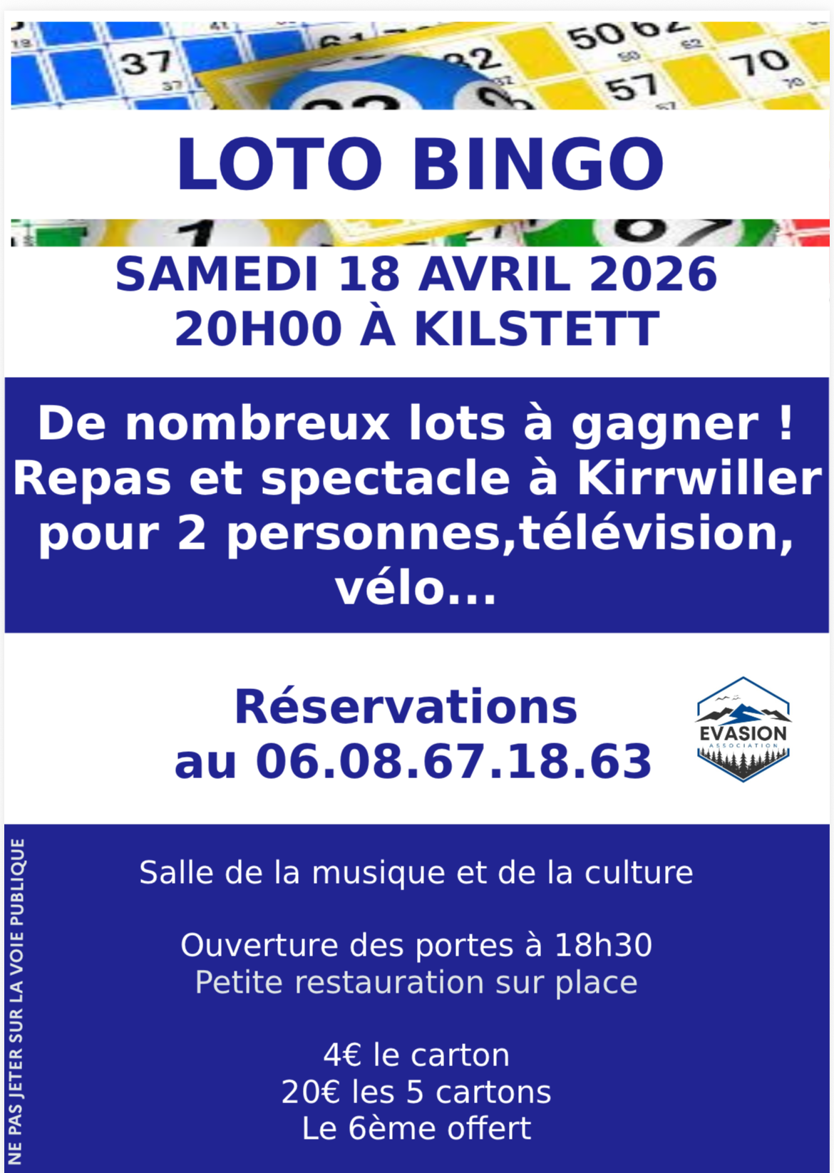 L’association Évasion vous donne rendez-vous pour une soirée conviviale et pleine de surprises : le samedi 18 avril 2026, à 20h (ouverture des portes à partir de 18h30), à la Salle de la Musique et de la Culture de Kilstett.